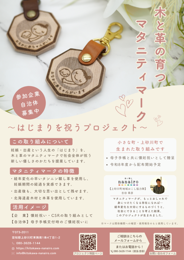 木と革という、時間とともに表情を変える素材を使い、妊娠期間の移ろいを“目に見えるかたち”として残します。